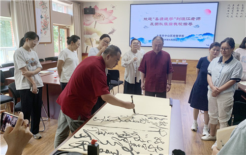 中山区培智学校以美著称,学校文化氛围浓郁,特聘书法教师栾老师现场书写苏轼的《定风波》,并诠释了苏轼写这首诗的背景及名句“也无风雨也无晴”的详解,让与会者无不慨叹苏轼的心性之沉稳,栾老师“草书”《定风波》全文,其布局谋篇深得书法之精髓,让我心生崇敬。